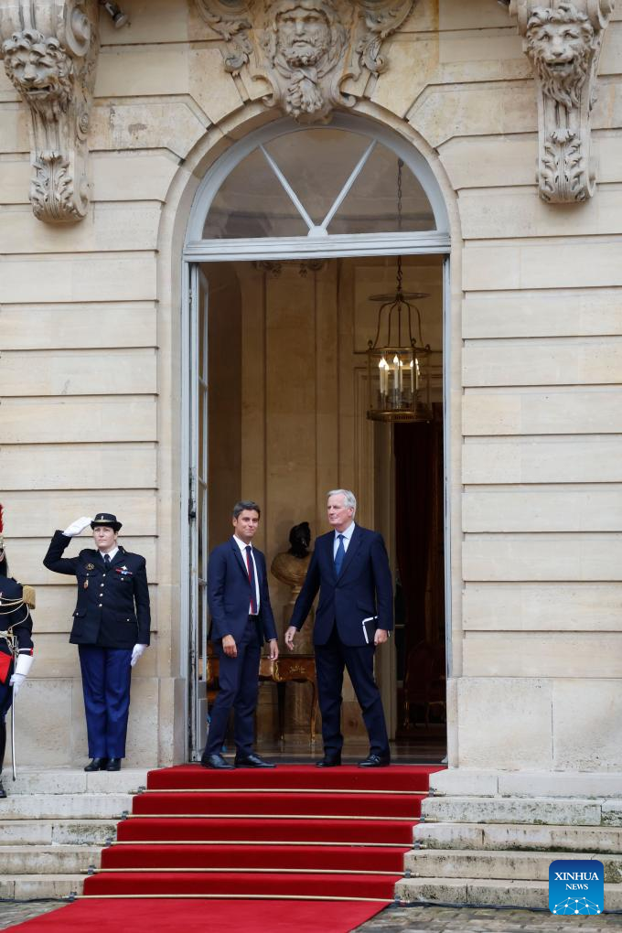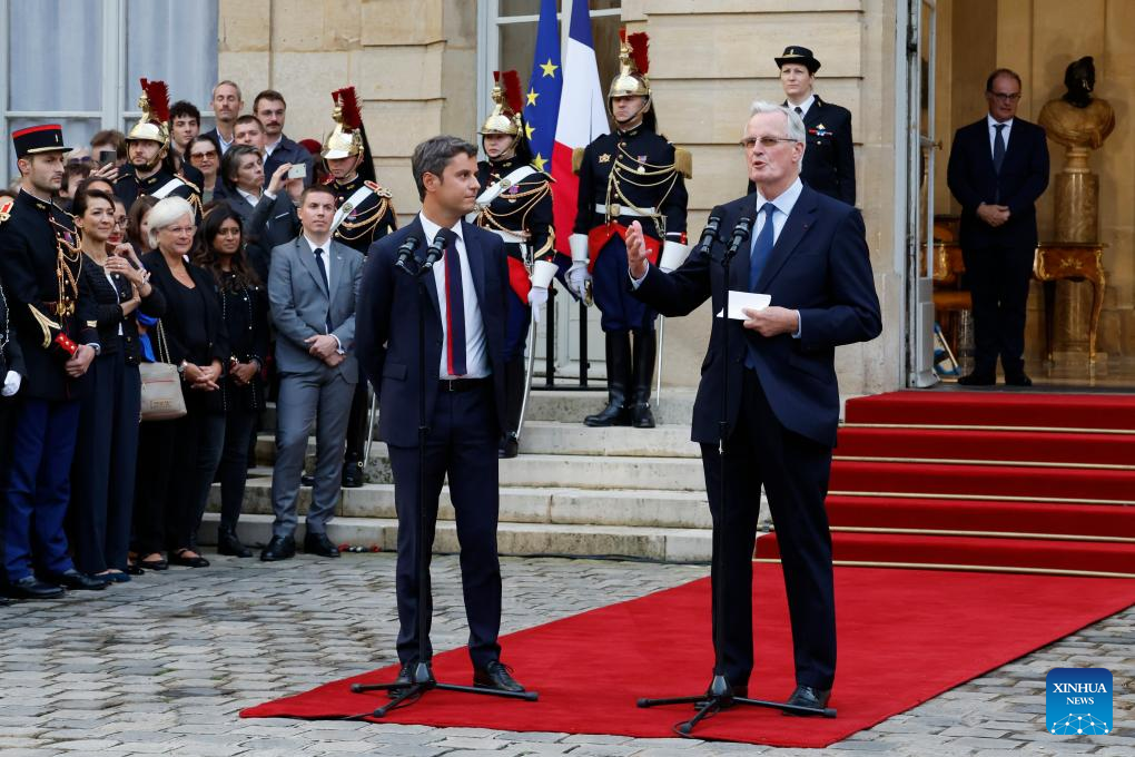 Newly appointed Prime minister Michel Barnier (R, Front) attends a handover ceremony at the Hotel Matignon in Paris, France, on Sept. 5, 2024. French President Emmanuel Macron has nominated former Brexit negotiator Michel Barnier as the new prime minister, the Elysee announced on Thursday. (Photo by Henri Szwarc/Xinhua)