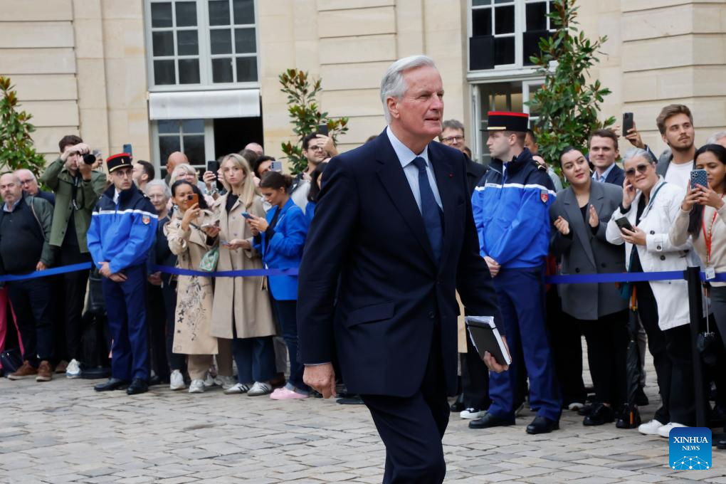 Newly appointed Prime minister Michel Barnier arrives to attend a handover ceremony at the Hotel Matignon in Paris, France, on Sept. 5, 2024. French President Emmanuel Macron has nominated former Brexit negotiator Michel Barnier as the new prime minister, the Elysee announced on Thursday. (Photo by Henri Szwarc/Xinhua)