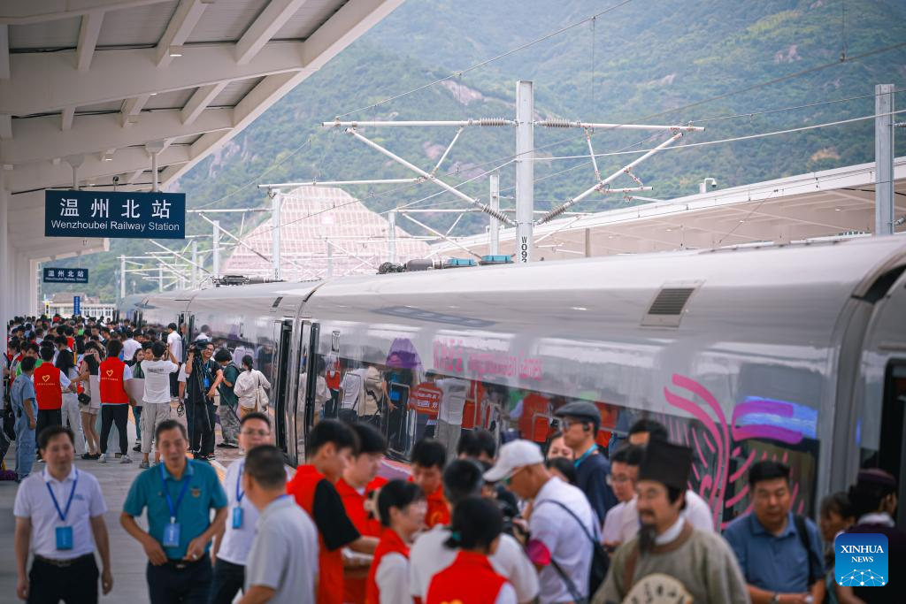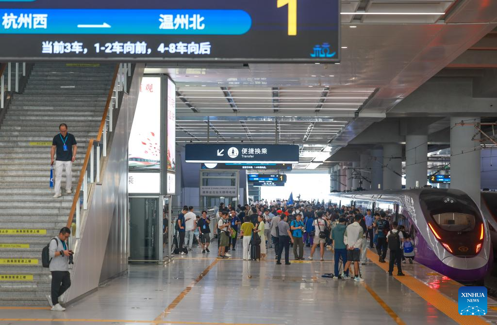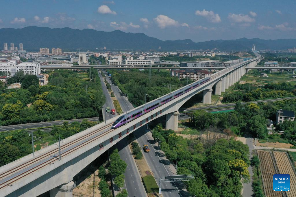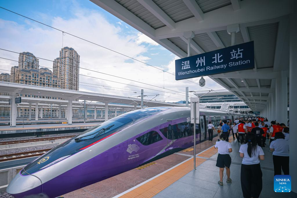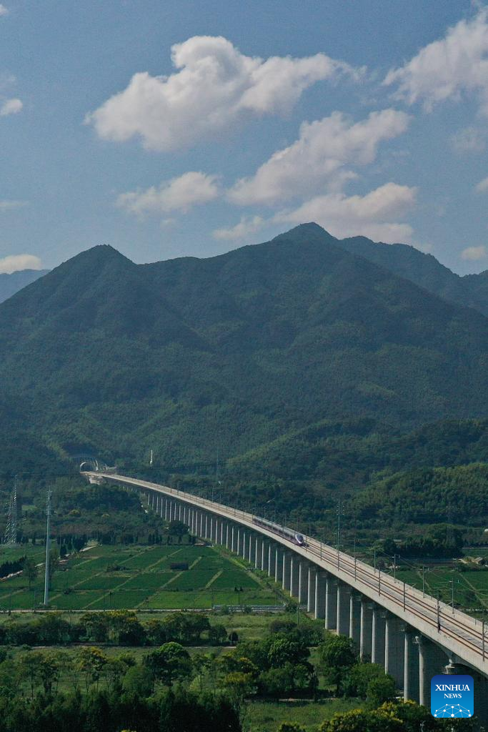 A new high-speed railway linking Hangzhou and Wenzhou in east China's Zhejiang Province began operations on Friday. The 276-km line, with a designed speed of 350 km per hour, has nine stations. Its operation offers a rapid transit solution along the route threading the economic hubs of Hangzhou, Yiwu and Wenzhou in one of the country's most economically vibrant regions. (Xinhua/Jiang Han)