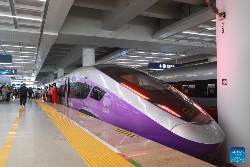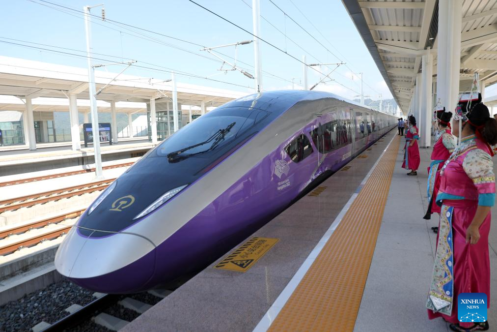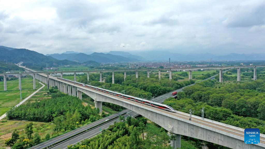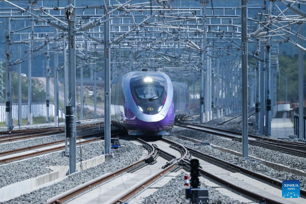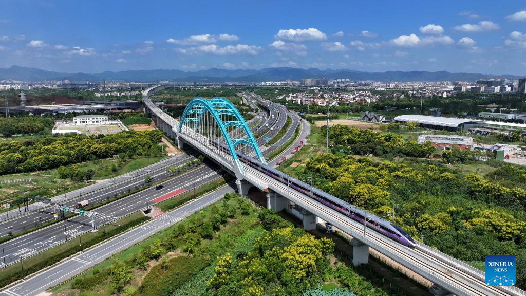 A new high-speed railway linking Hangzhou and Wenzhou in east China's Zhejiang Province began operations on Friday. The 276-km line, with a designed speed of 350 km per hour, has nine stations. Its operation offers a rapid transit solution along the route threading the economic hubs of Hangzhou, Yiwu and Wenzhou in one of the country's most economically vibrant regions. (Xinhua/Jiang Han)