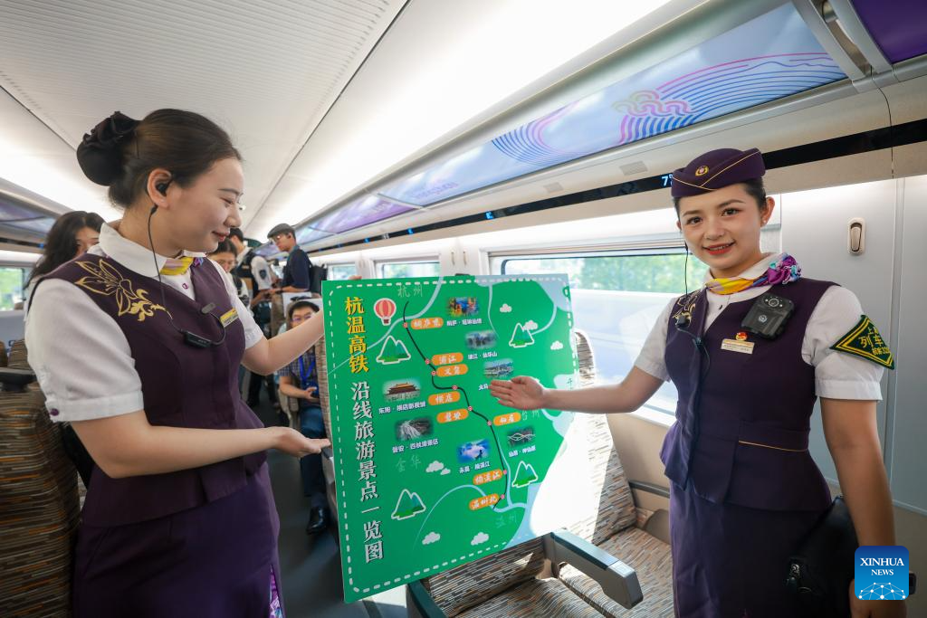 Train attendants introduce the scenic spots along the Hangzhou-Wenzhou high-speed railway on the bullet train No. G9505, Sept. 6, 2024.