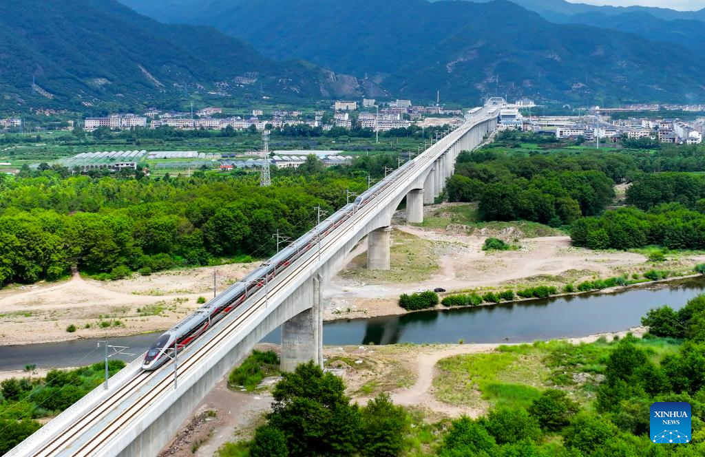 An aerial drone photo taken on Sept. 6, 2024 shows a bullet train running along the Hangzhou-Wenzhou high-speed railway in Xianju County, east China's Zhejiang Province.