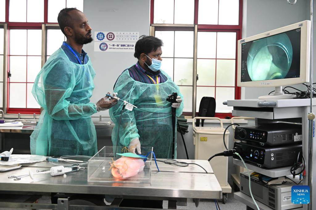 Foreign trainees under the Belt and Road Training Program for Healthcare Excellence learn to use endoscope at Jiangsu Province Hospital in Nanjing, capital of east China's Jiangsu Province, Sept. 4, 2024. The training program, lasting from Sept. 1 to 15, is attended by 45 trainees from 15 Belt and Road Initiative (BRI) partner countries with a main focus on first aid and digestive endoscopy. (Xinhua/Ji Chunpeng)