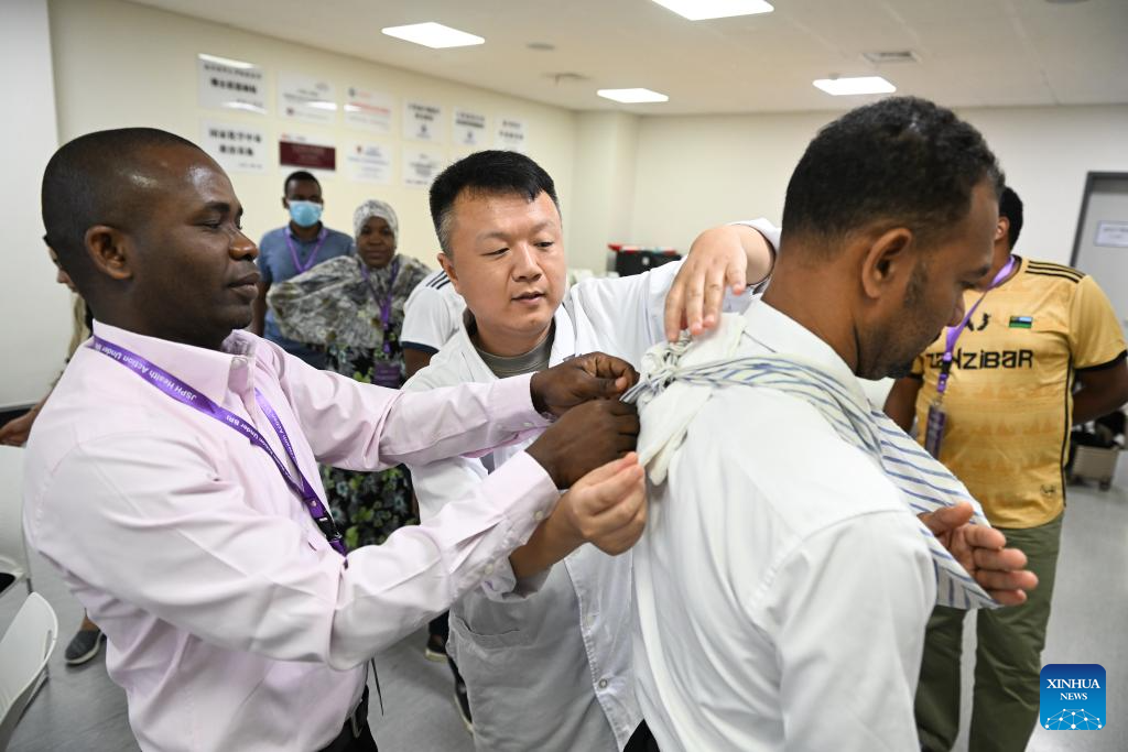 A Chinese doctor (C) teaches bandage-fixing therapy to foreign trainees under the Belt and Road Training Program for Healthcare Excellence at Jiangsu Province Hospital in Nanjing, capital of east China's Jiangsu Province, Sept. 4, 2024. The training program, lasting from Sept. 1 to 15, is attended by 45 trainees from 15 Belt and Road Initiative (BRI) partner countries with a main focus on first aid and digestive endoscopy. (Xinhua/Ji Chunpeng)
