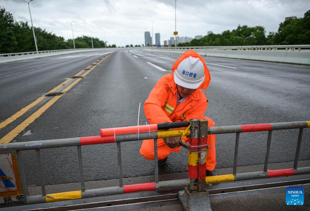 A staff member sets barricades at the entrance of a bridge in Haikou, south China's Hainan Province, Sept. 6, 2024. Super Typhoon Yagi, the 11th typhoon of this year, has brought heavy rainfall and strong winds cross most of China's island province of Hainan. Some bridges and tunnels in Haikou, the provincial capital, have been temporarily closed. (Xinhua/Pu Xiaoxu)