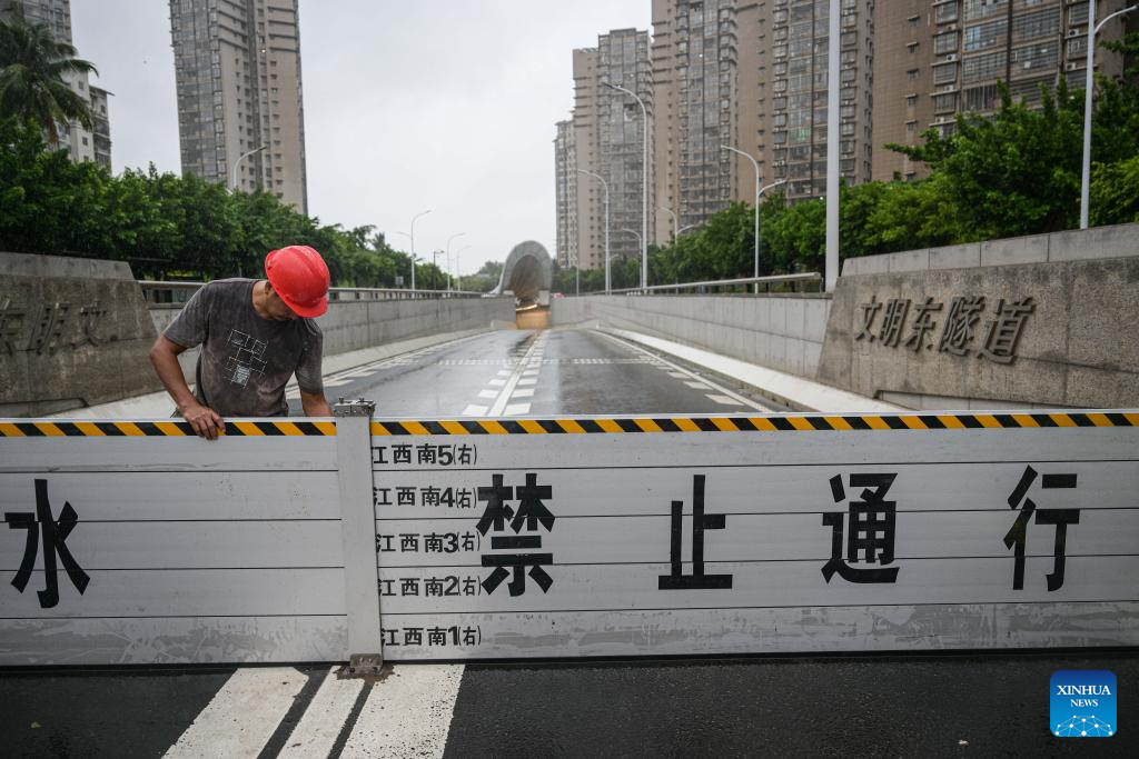 A staff member sets barricades at the entrance of a tunnel in Haikou, south China's Hainan Province, Sept. 6, 2024. Super Typhoon Yagi, the 11th typhoon of this year, has brought heavy rainfall and strong winds cross most of China's island province of Hainan. Some bridges and tunnels in Haikou, the provincial capital, have been temporarily closed. (Xinhua/Pu Xiaoxu)