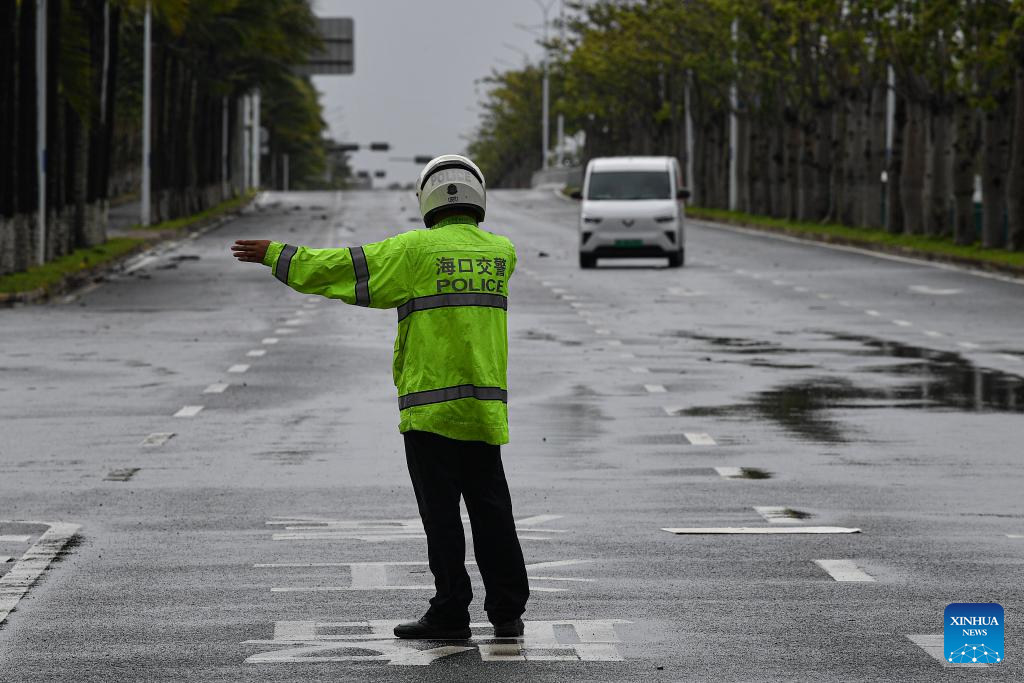 A traffic police officer guides the traffic at the entrance of a closed tunnel in Haikou, south China's Hainan Province, Sept. 6, 2024. Super Typhoon Yagi, the 11th typhoon of this year, has brought heavy rainfall and strong winds cross most of China's island province of Hainan. Some bridges and tunnels in Haikou, the provincial capital, have been temporarily closed. (Xinhua/Pu Xiaoxu)
