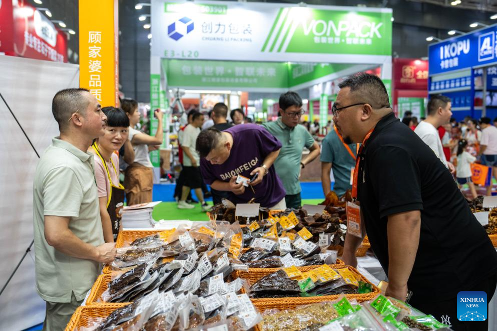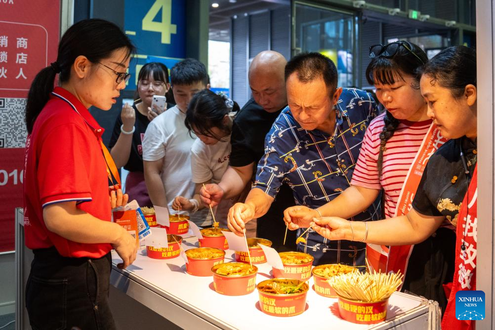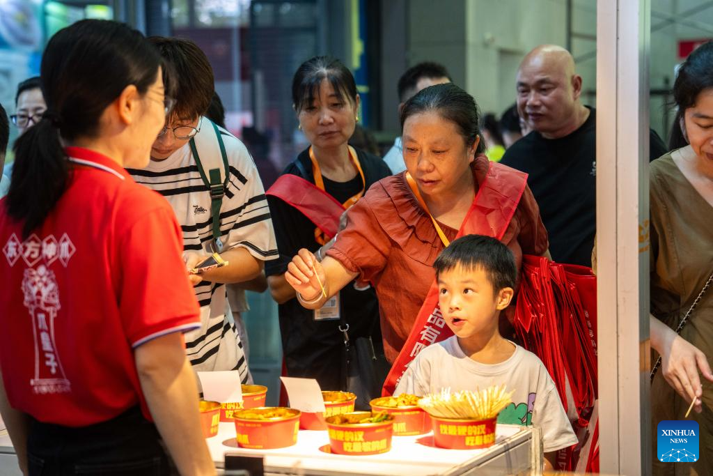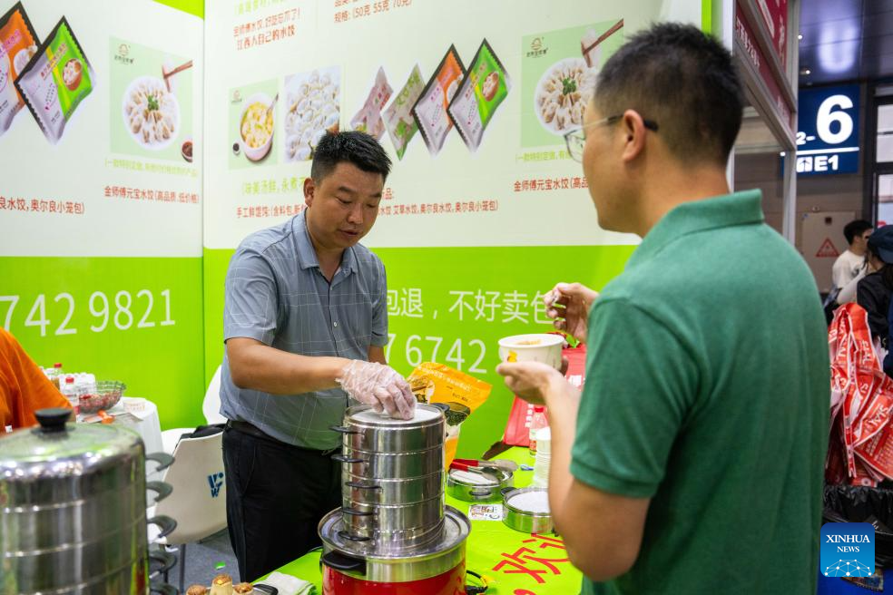 Visitors try snacks during the 9th China International Food and Catering Expo in Changsha, central China's Hunan Province, Sept. 6, 2024. The expo kicked off in Changsha on Friday, with more than 1000 companies showcasing their new products, technologies and achievements. (Xinhua/Chen Sihan)