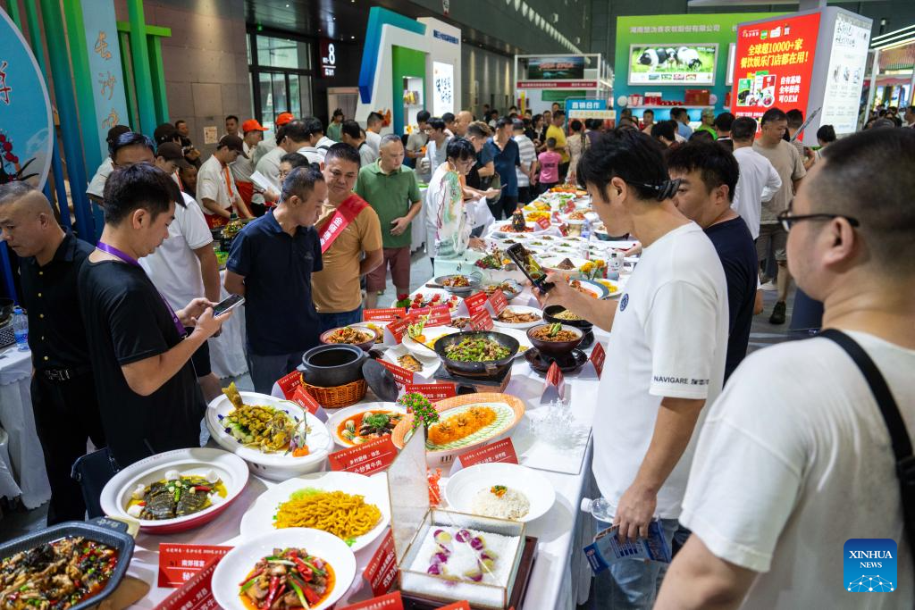 Visitors look at special meals displayed during the 9th China International Food and Catering Expo in Changsha, central China's Hunan Province, Sept. 6, 2024. The expo kicked off in Changsha on Friday, with more than 1000 companies showcasing their new products, technologies and achievements. (Xinhua/Chen Sihan)