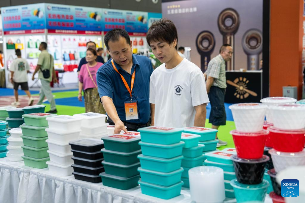 An exhibitor (L) shows meal boxes during the 9th China International Food and Catering Expo in Changsha, central China's Hunan Province, Sept. 6, 2024. The expo kicked off in Changsha on Friday, with more than 1000 companies showcasing their new products, technologies and achievements. (Xinhua/Chen Sihan)