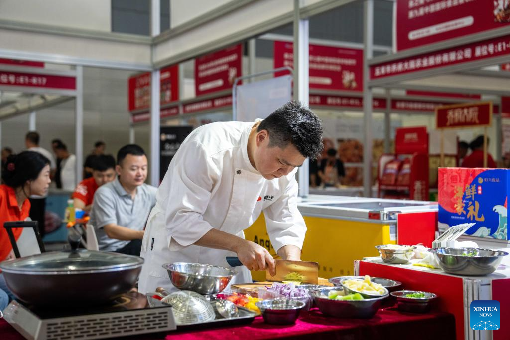 An exhibitor shows cooking skills during the 9th China International Food and Catering Expo in Changsha, central China's Hunan Province, Sept. 6, 2024. The expo kicked off in Changsha on Friday, with more than 1000 companies showcasing their new products, technologies and achievements. (Xinhua/Chen Sihan)