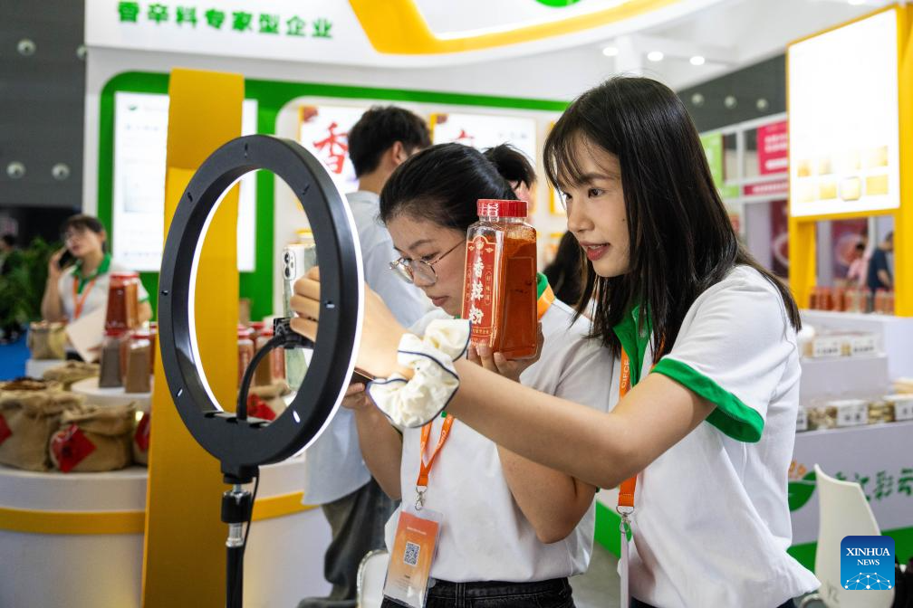 An exhibitor promotes spices through live streaming during the 9th China International Food and Catering Expo in Changsha, central China's Hunan Province, Sept. 6, 2024. The expo kicked off in Changsha on Friday, with more than 1000 companies showcasing their new products, technologies and achievements. (Xinhua/Chen Sihan)