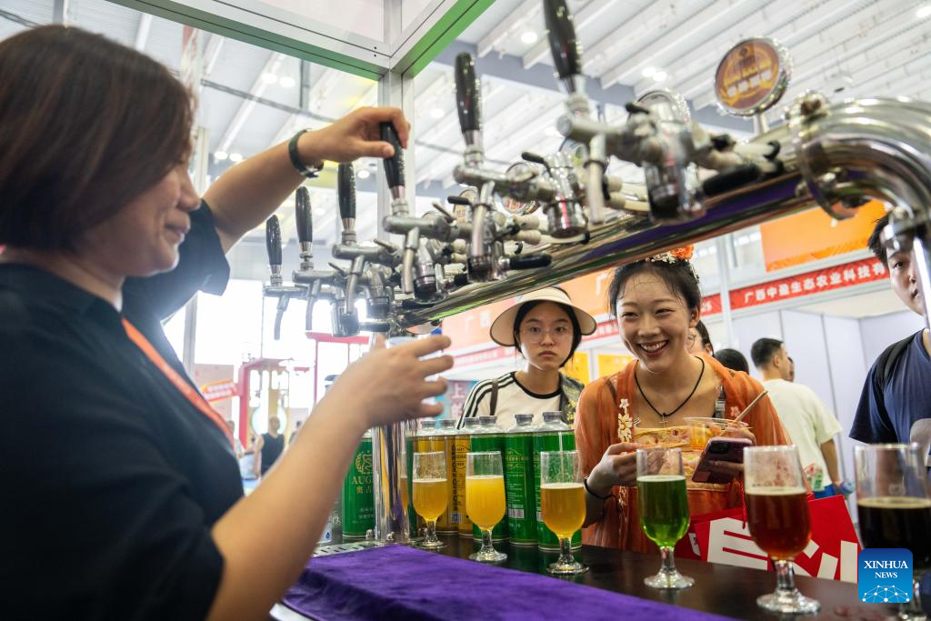 Visitors wait for beer tasting during the 9th China International Food and Catering Expo in Changsha, central China's Hunan Province, Sept. 6, 2024. The expo kicked off in Changsha on Friday, with more than 1000 companies showcasing their new products, technologies and achievements. (Xinhua/Chen Sihan)