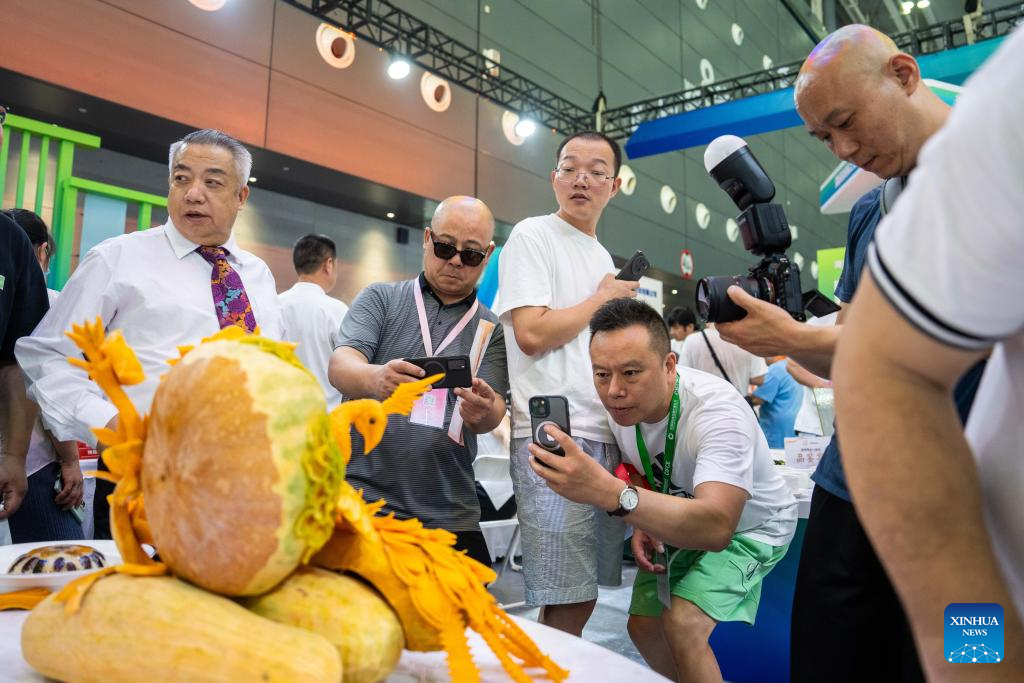 People take photos of a carved pumpkin displayed during the 9th China International Food and Catering Expo in Changsha, central China's Hunan Province, Sept. 6, 2024. The expo kicked off in Changsha on Friday, with more than 1000 companies showcasing their new products, technologies and achievements. (Xinhua/Chen Sihan)