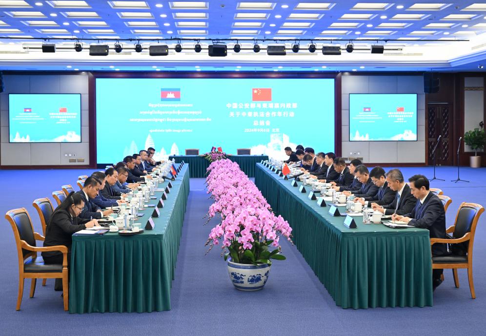 BEIJING, Sept. 6 (Xinhua) -- Chinese State Councilor and Minister of Public Security Wang Xiaohong co-chaired a wrap-up meeting of the Year of Law Enforcement Cooperation activities between China and Cambodia with Cambodian Deputy Prime Minister and Minister of Interior Sar Sokha in Beijing on Friday.
