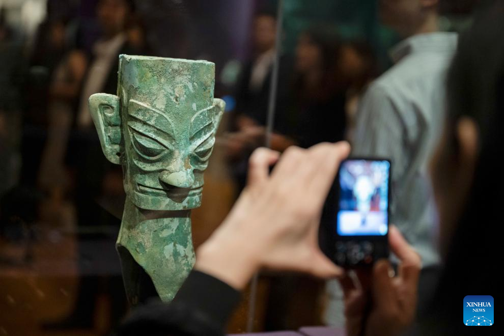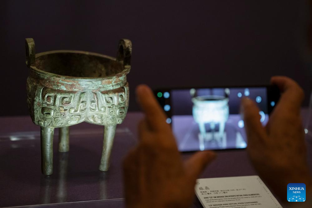 A visitor takes photos at an exhibition "The Splendor of Chinese Bronzes: Masterpieces from the National Museum of China" at Macao Museum of Art in Macao, south China, Sept. 6, 2024. The exhibition kicked off on Friday in Macao, showcasing more than 150 ancient bronzes from the collection of the National Museum of China. (Xinhua/Cheong Kam Ka)