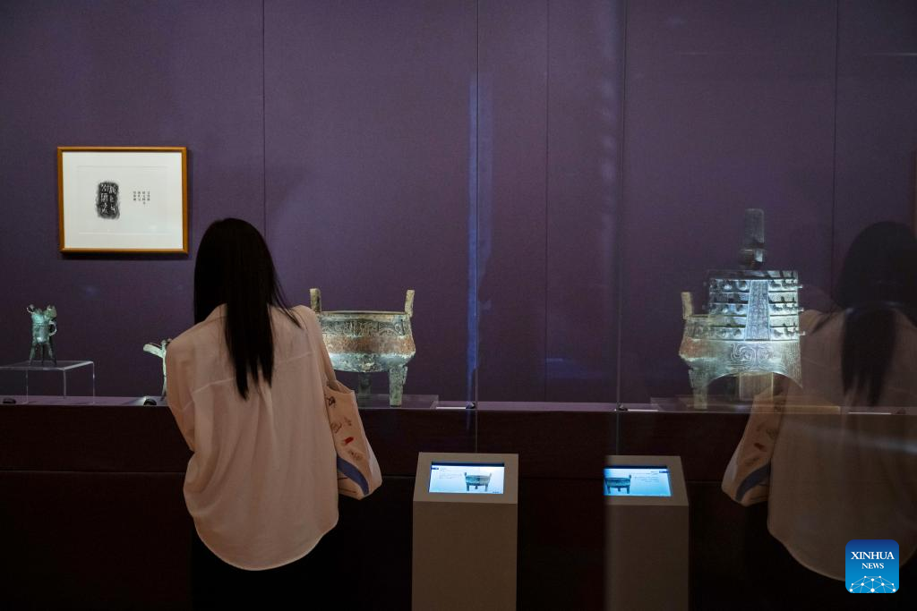 A visitor watches the exhibits at an exhibition "The Splendor of Chinese Bronzes: Masterpieces from the National Museum of China" at Macao Museum of Art in Macao, south China, Sept. 6, 2024. The exhibition kicked off on Friday in Macao, showcasing more than 150 ancient bronzes from the collection of the National Museum of China. (Xinhua/Cheong Kam Ka)