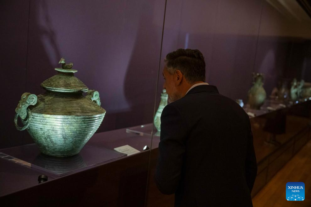 A visitor looks at an exhibit at an exhibition "The Splendor of Chinese Bronzes: Masterpieces from the National Museum of China" at Macao Museum of Art in Macao, south China, Sept. 6, 2024. The exhibition kicked off on Friday in Macao, showcasing more than 150 ancient bronzes from the collection of the National Museum of China. (Xinhua/Cheong Kam Ka)