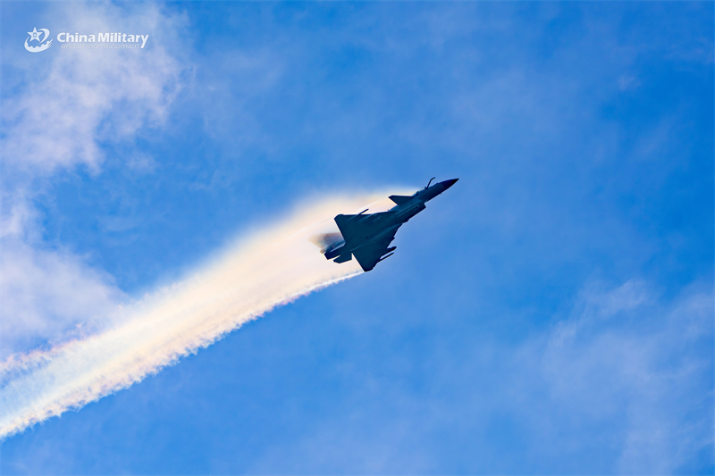 Fighter jet attached to an aviation brigade under the Chinese PLA Southern Theater Command speeds up during a round-the-clock flight training exercise on August 7, 2024. (eng.chinamil.com.cn/Photo by Hou Kaiwen)