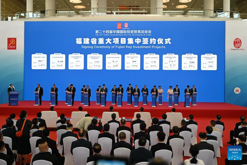 The singing ceremony of Fujian key investment projects is held during the 24th China International Fair for Investment and Trade (CIFIT) in Xiamen, southeast China's Fujian Province, Sept. 8, 2024. (Xinhua/Lin Shanchuan)