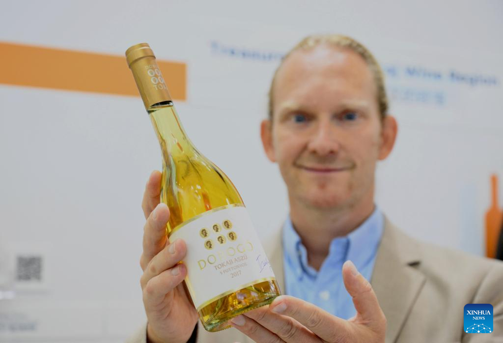 A wine merchant from Hungary displays a bottle of wine produced in Hungary's Tokaj wine area during the 24th China International Fair for Investment and Trade (CIFIT) in Xiamen, southeast China's Fujian Province, Sept. 8, 2024. (Xinhua/Wei Peiquan)