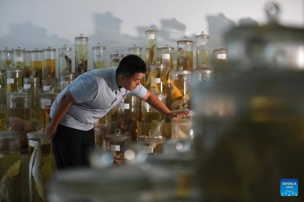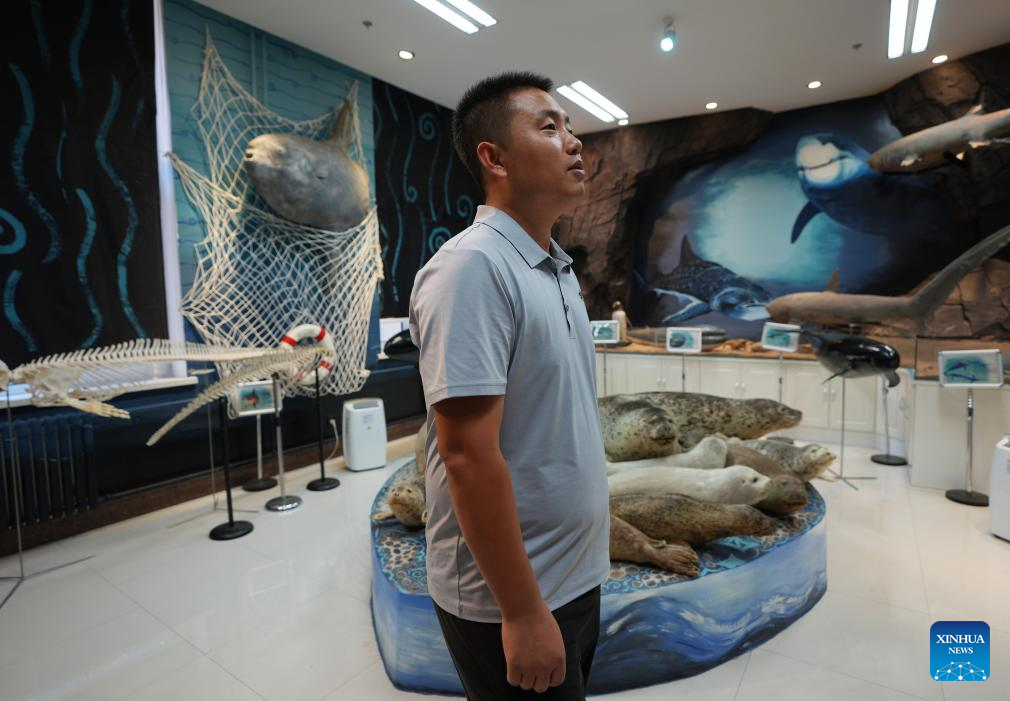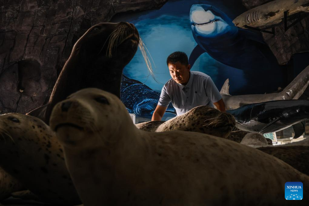 Wang Zhen arranges spotted seal specimens in the Liaoning Ocean and Fisheries Science Research Institute in Dalian, northeast China's Liaoning Province, Sept. 6, 2024. (Xinhua/Liu Dawei)