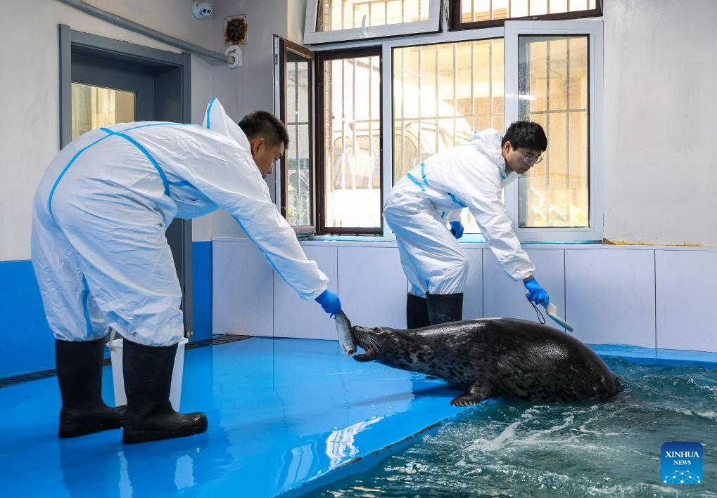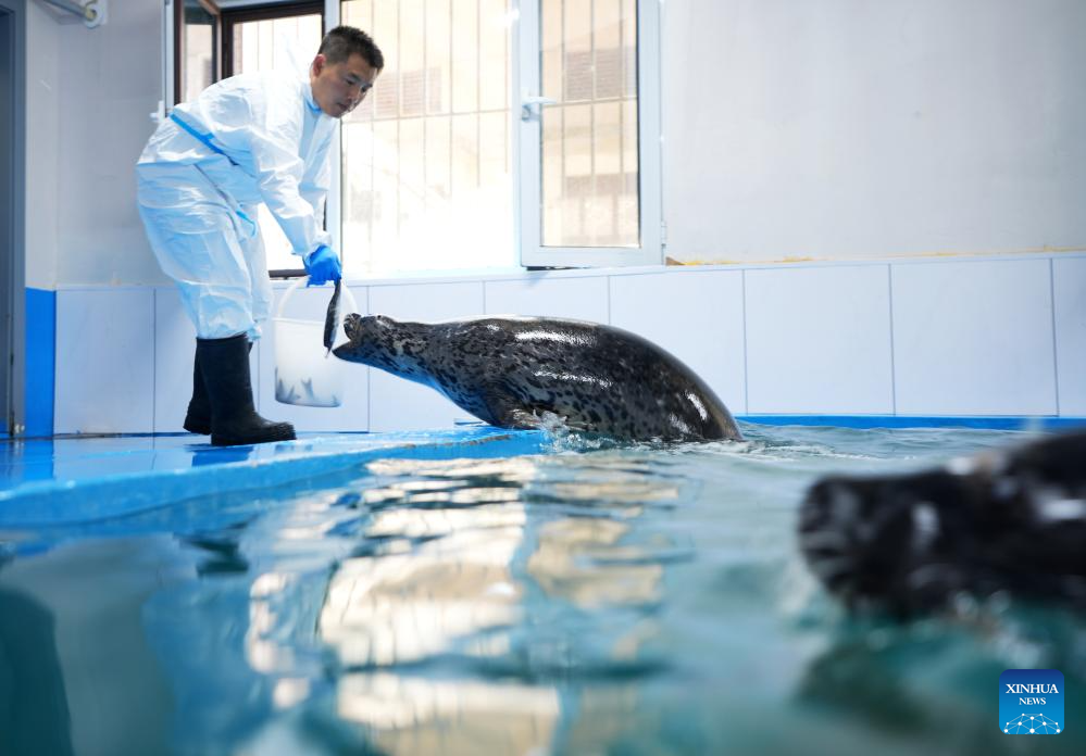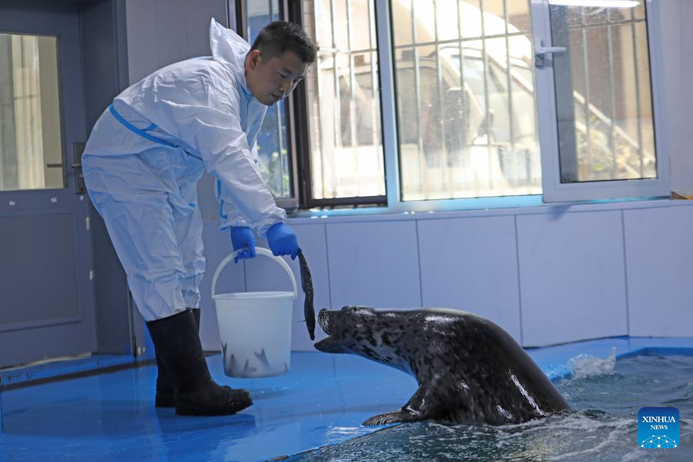 Wang Zhen feeds a spotted seal at the spotted seal rescue center of Liaoning Ocean and Fisheries Science Research Institute in Dalian, northeast China's Liaoning Province, Sept. 6, 2024. (Xinhua/Yang Qing)