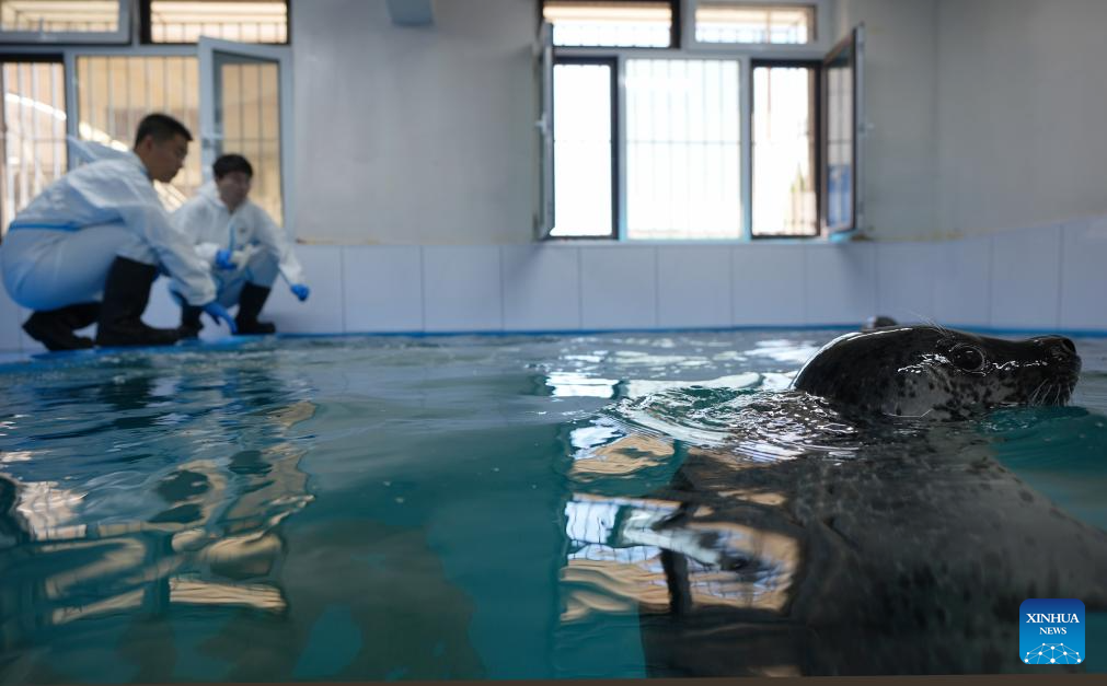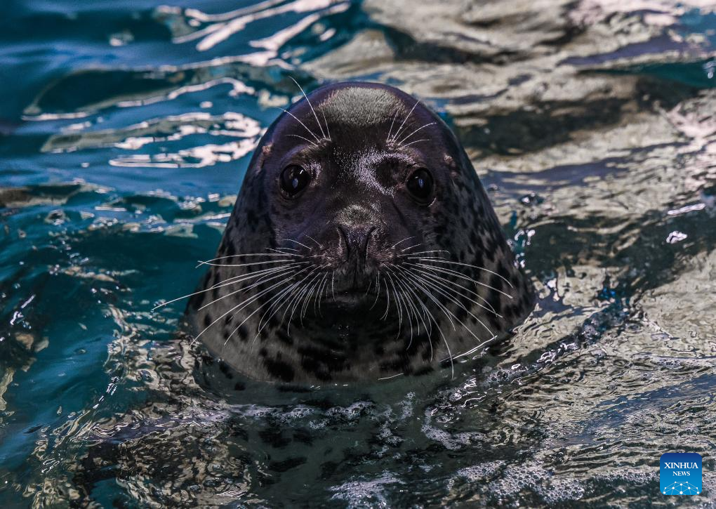 A spotted seal is pictured at the spotted seal rescue center of Liaoning Ocean and Fisheries Science Research Institute in Dalian, northeast China's Liaoning Province, Sept. 6, 2024. (Xinhua/Liu Dawei)