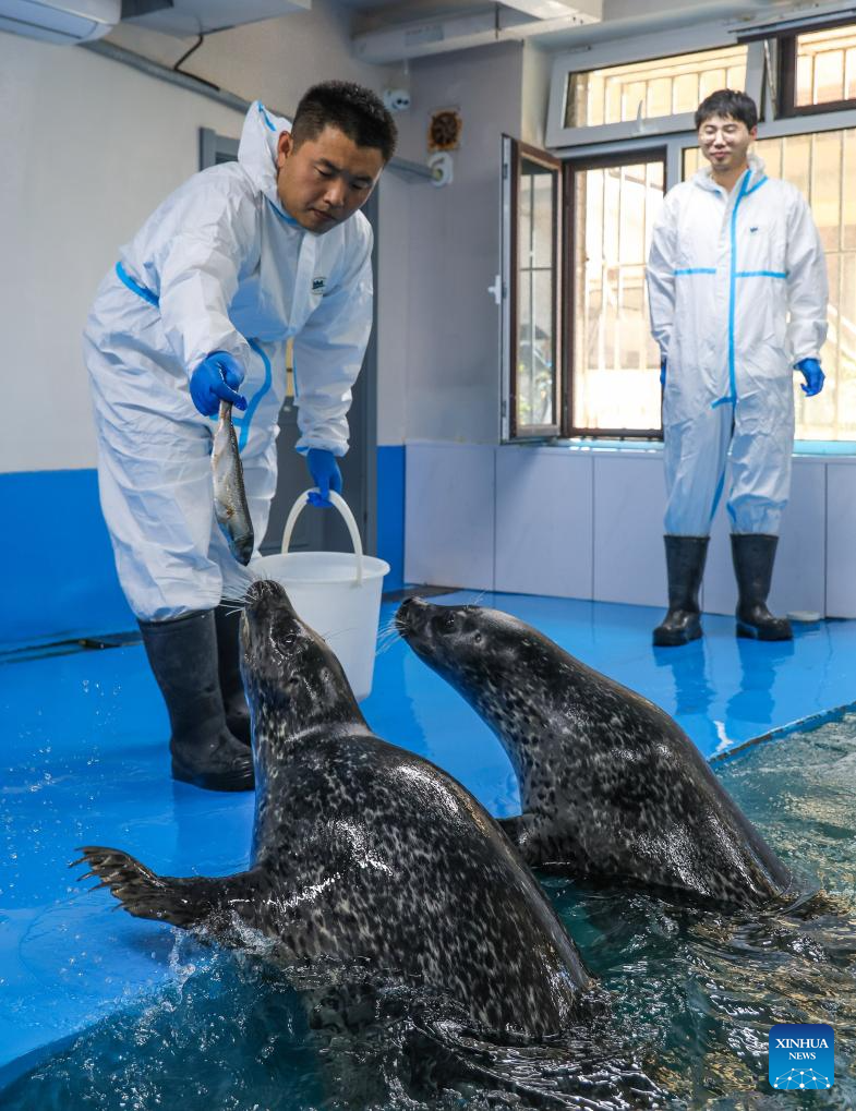 Wang Zhen (L) feeds spotted seals at the spotted seal rescue center of Liaoning Ocean and Fisheries Science Research Institute in Dalian, northeast China's Liaoning Province, Sept. 6, 2024. (Xinhua/Liu Dawei)