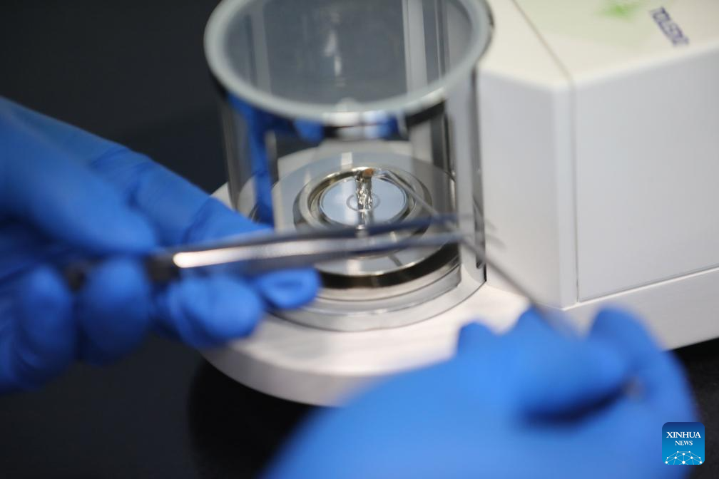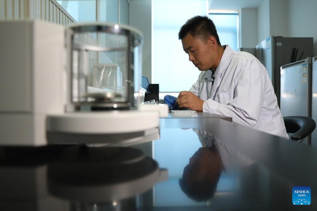 Wang Zhen weighs an animal sample in the Liaoning Ocean and Fisheries Science Research Institute in Dalian, northeast China's Liaoning Province, Sept. 6, 2024. (Xinhua/Yang Qing)