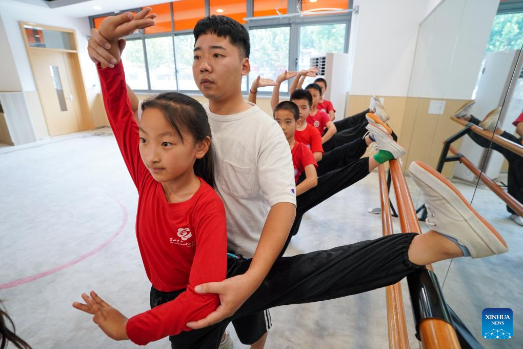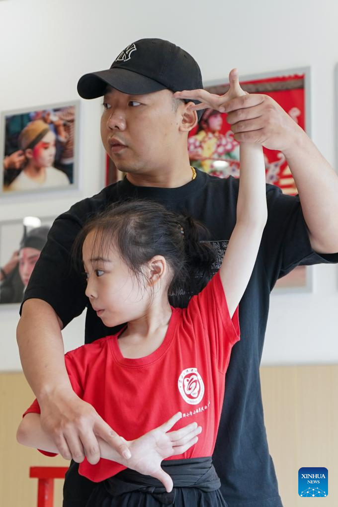 Zhou Jie, a full-time teacher of the "little Kunqu Opera training class," guides a pupil at a training room of Shipai Center Primary School of Kunshan in Kunshan City, east China's Jiangsu Province, Sept. 6, 2024. Born in 1995 and raised up in Kunshan City of east China's Jiangsu Province, Zhou Jie's childhood memories were filled with Kunqu Opera on every festivals and celebrations. (Xinhua/Li Bo)