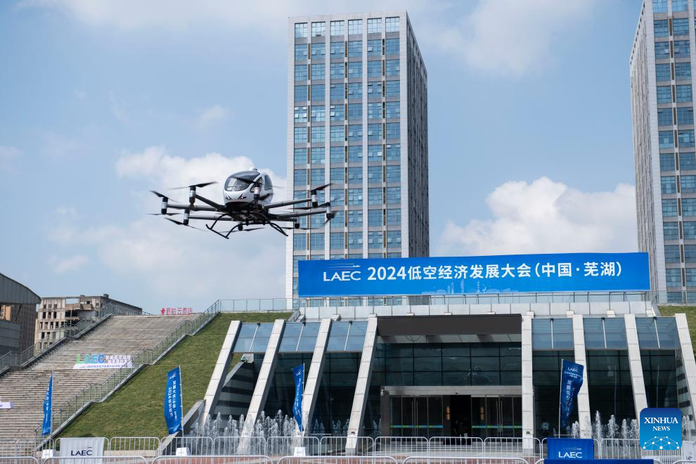 A low-altitude aircraft makes a flight demonstration outside the venue of the 2024 Low Altitude Economic Development Conference in Wuhu, east China's Anhui Province, Sept. 6, 2024. (Xinhua/Fu Tian)
