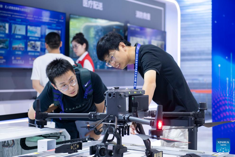 A visitor learns about an inspection drone at an exhibition of the 2024 Low Altitude Economic Development Conference in Wuhu, east China's Anhui Province, Sept. 6, 2024. (Xinhua/Fu Tian)