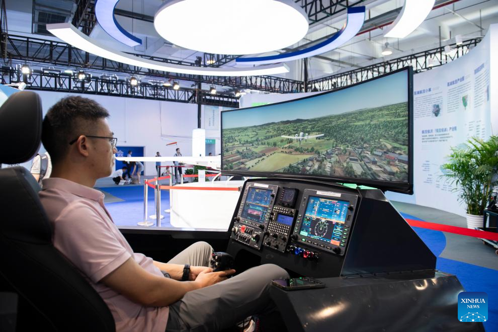 A visitor takes a flight simulator at an exhibition of the 2024 Low Altitude Economic Development Conference in Wuhu, east China's Anhui Province, Sept. 6, 2024. (Xinhua/Fu Tian)