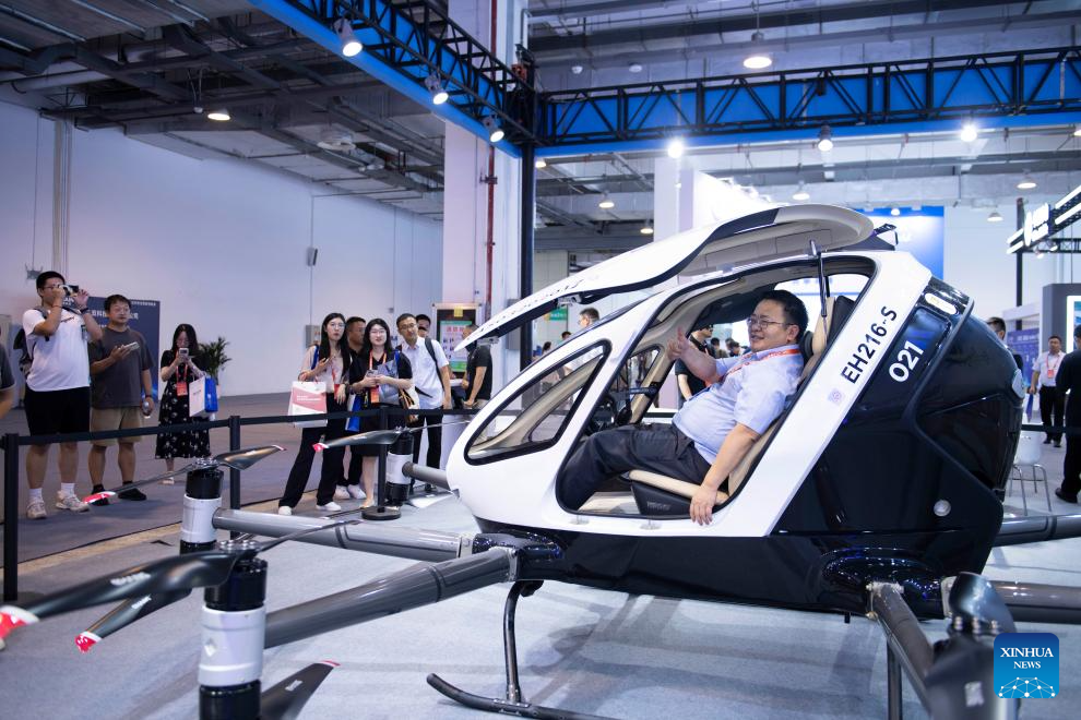 A visitor takes an electric aircraft at an exhibition of the 2024 Low Altitude Economic Development Conference in Wuhu, east China's Anhui Province, Sept. 6, 2024. (Xinhua/Fu Tian)