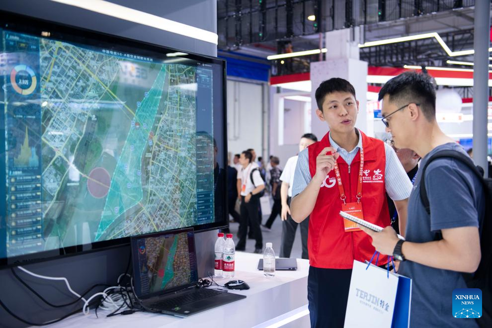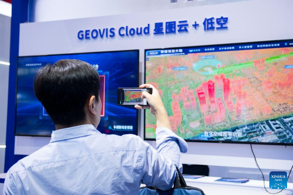 A visitor takes photos of the digital low-altitude brain product used for urban airspace management at an exhibition of the 2024 Low Altitude Economic Development Conference in Wuhu, east China's Anhui Province, Sept. 6, 2024. (Xinhua/Fu Tian)