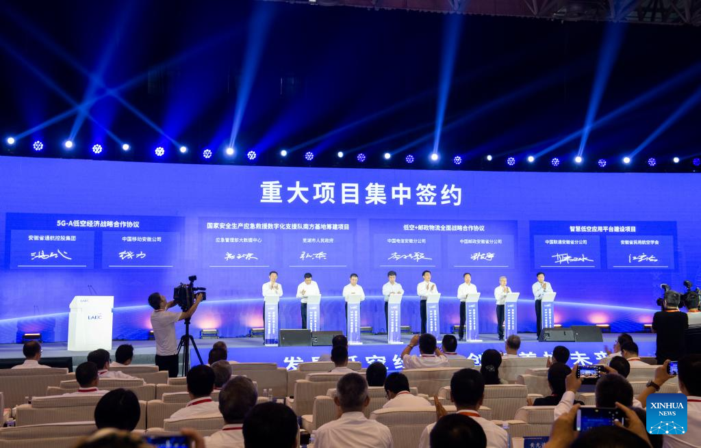 A signing ceremony of major projects is held during the opening ceremony of the 2024 Low Altitude Economic Development Conference in Wuhu, east China's Anhui Province, Sept. 7, 2024. (Xinhua/Fu Tian)