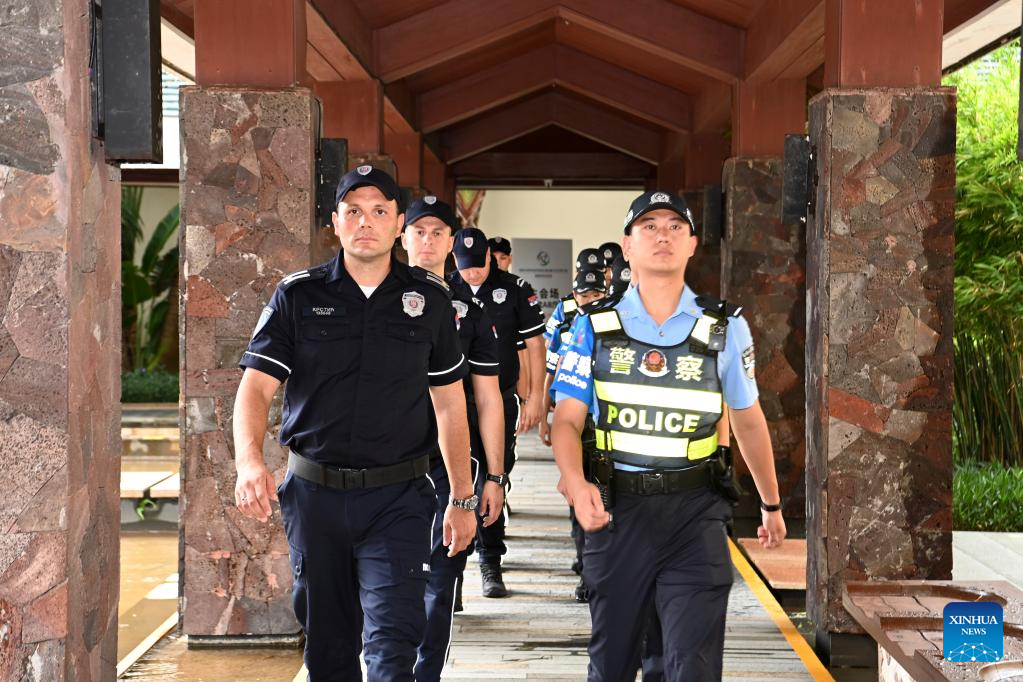 Serbian and Chinese police officers carry out joint police patrol in Sanya, south China's Hainan Province, Sept. 7, 2024.?(Xinhua)