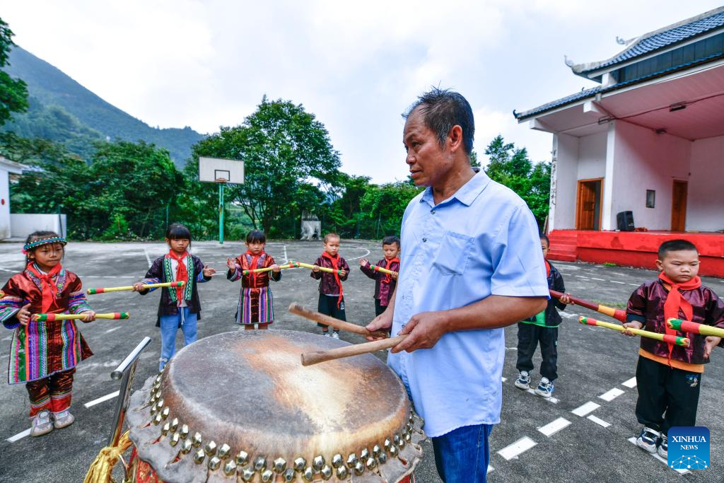 Meng Rongda teaches students to practice Yao ethnic drum dance at Zhongzhai teaching site in Xishan Township of Congjiang County, southwest China's Guizhou Province, Sept. 6, 2024. (Xinhua/Yang Wenbin)