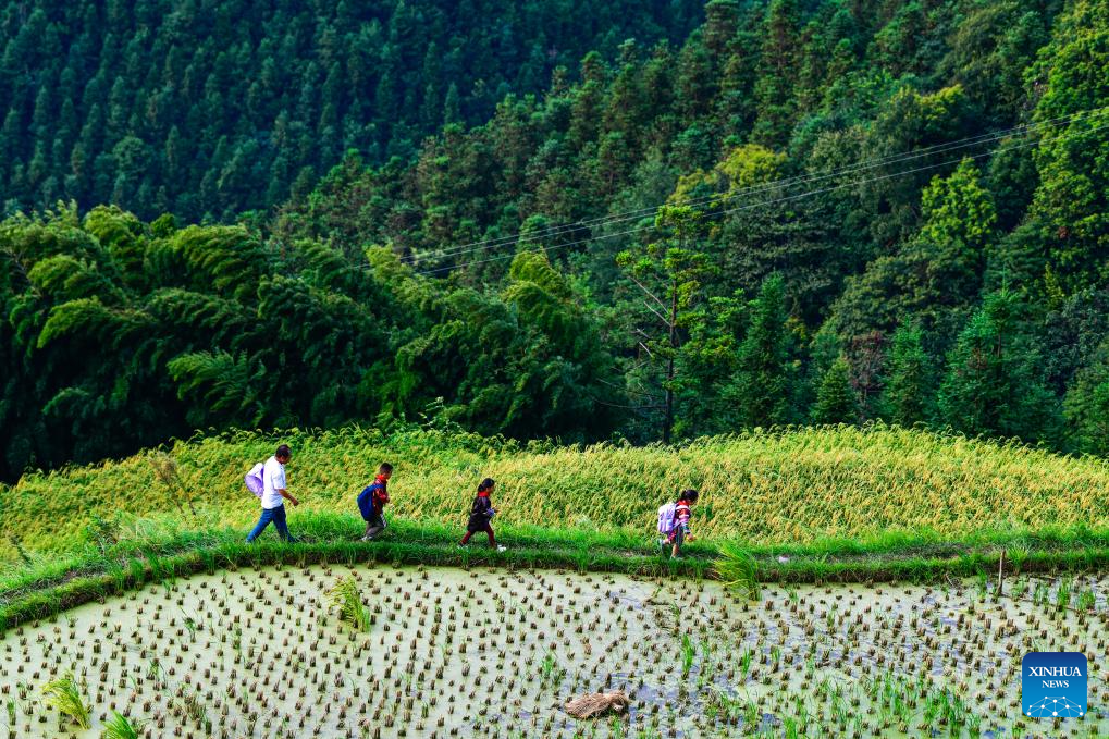 Meng Rongda accompanies students after school on their way home in Xishan Township of Congjiang County, southwest China's Guizhou Province, Sept. 5, 2024. (Xinhua/Yang Wenbin)