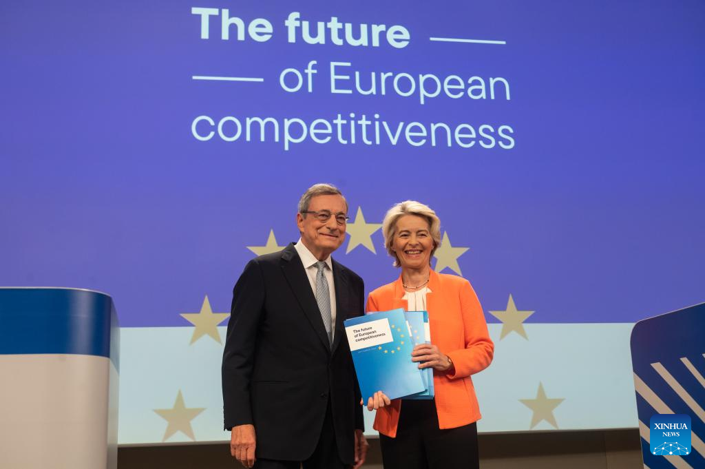 European Commission President Ursula von der Leyen (R) and Mario Draghi pose for a photo at a press conference on the report of the future of European competitiveness in Brussels, Belgium, on Sept. 9, 2024. Mario Draghi, former Italian prime minister and former governor of the European Central Bank, on Monday released a long-awaited report with his recommendations on how to improve the economic competitiveness of the European Union (EU). (European Union/Handout via Xinhua)