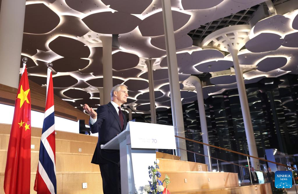 Norwegian Prime Minister Jonas Gahr Store addresses a reception to celebrate the 70th anniversary of the establishment of diplomatic relations between China and Norway in Beijing, capital of China, Sept. 9, 2024. Chinese Vice Premier Zhang Guoqing, also a member of the Political Bureau of the Communist Party of China Central Committee, and Store attended the reception here on Monday. (Xinhua/Pang Xinglei)