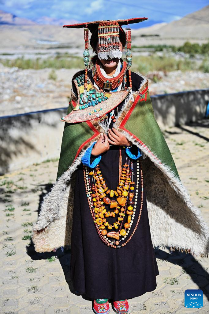 A villager displays folk costume in Kejia Village of Pulan County, southwest China's Xizang Autonomous Region, Sept. 9, 2024. Originating in Pulan County, Pulan folk costume has been a traditional garment worn at celebrations for over a millennium. Weighing more than 20 kilograms, a piece of this unique costume is usually decorated with rare metals and jewels, like gold, silver, beeswax, coral and turquoise. (Xinhua/Sun Ruibo)