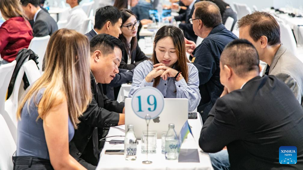 Attendees communicate at the China (Shandong)-Serbia Economic and Trade Cooperation Forum in Belgrade, Serbia, on Sept. 10, 2024. Over 150 Chinese and 80 Serbian companies gathered at Belgrade's Sava Centre on Tuesday for a high-profile forum aimed at deepening economic and trade cooperation between Serbia and China's Shandong province, marking a significant boost to bilateral ties. (Photo by Wang Wei/Xinhua)