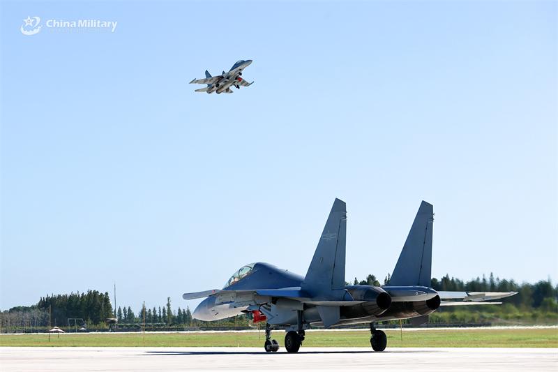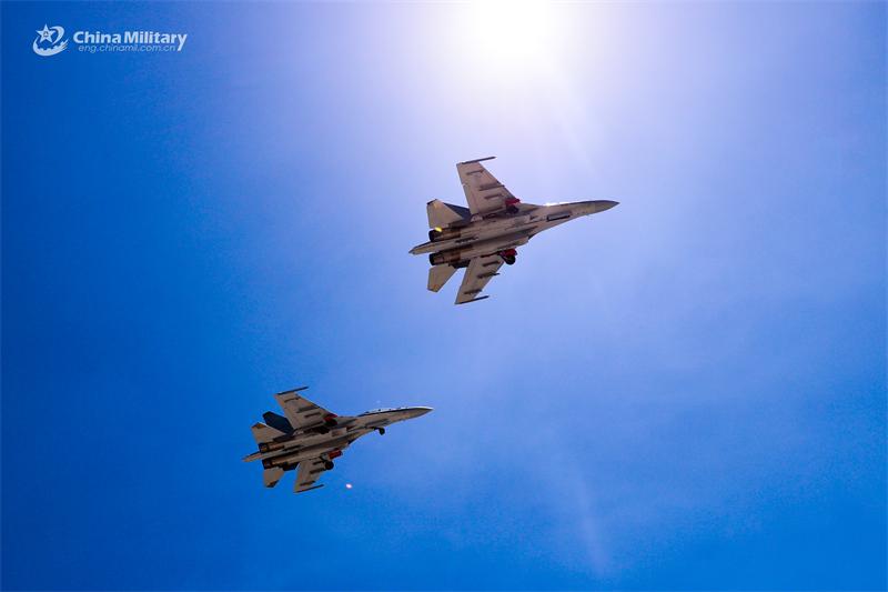 Fighter jets attached to an aviation brigade with the air force under the Chinese PLA Eastern Theater Command soar in the sky during a flight training exercise on July 30, 2024. (eng.chinamil.com.cn/Photo by Zhan Peng)