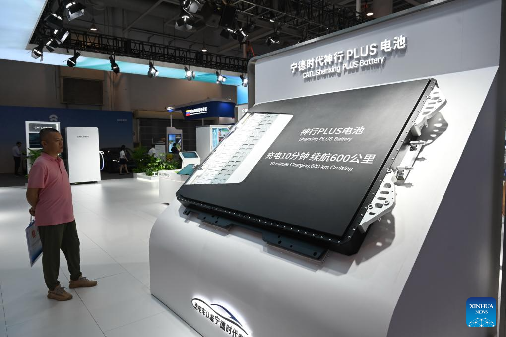 A visitor views a CATL's "Shenxing Plus" battery at the exhibition of BRICS New Industrial Revolution 2024 in Xiamen, southeast China's Fujian Province, Sept. 10, 2024. The BRICS Forum on Partnership on New Industrial Revolution 2024 opened here on Tuesday, with the theme "Fostering high-quality partnership and embarking on a new journey of new industrialization." (Xinhua/Lin Shanchuan)