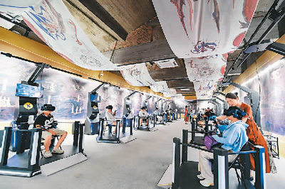 Visitors use equipment to visit the Mogao Grottoes at a digital exhibition hall of the grottoes in Dunhuang city, northwest China's Gansu Province. (Xinhua/Lang Bingbing)
