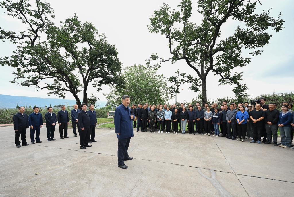 Chinese President Xi Jinping, also general secretary of the Communist Party of China Central Committee and chairman of the Central Military Commission, visits a local apple production base to learn about the development of the modern specialty fruit industry in mountainous areas in Tianshui, northwest China's Gansu Province, Sept. 11, 2024. Xi inspected the city of Baoji in northwest China's Shaanxi Province and the city of Tianshui in neighboring Gansu Province from Tuesday afternoon to Wednesday morning. (Xinhua/Xie Huanchi)