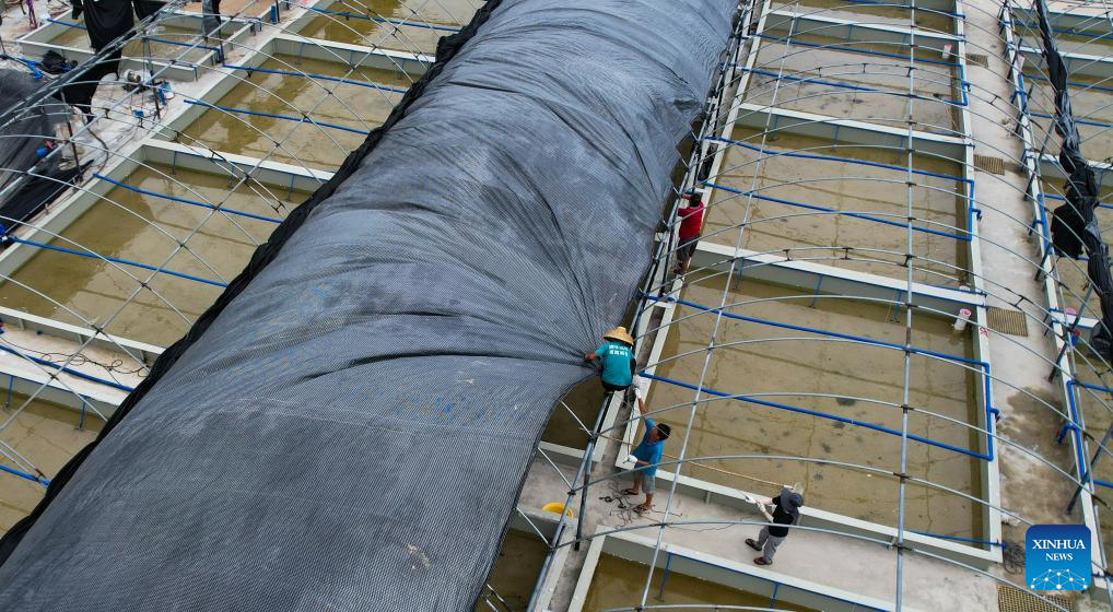 An aerial drone photo shows staff members setting up ceilings for a shrimp fry factory in Wenchang, south China's Hainan Province, Sept. 10, 2024. Hainan has witnessed its production gradually resumed after Super Typhoon Yagi, the 11th typhoon of the year, made landfall in Hainan on Friday and brought damage across the island. (Xinhua/Yang Guanyu)