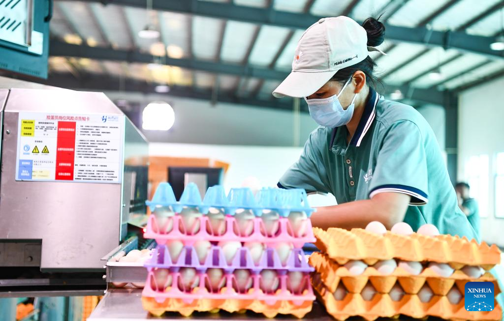 A worker packs eggs at an animal husbandry company in Chengmai County of south China's Hainan Province, Sept. 9, 2024. Hainan has witnessed its production gradually resumed after Super Typhoon Yagi, the 11th typhoon of the year, made landfall in Hainan on Friday and brought damage across the island. (Xinhua/Yang Guanyu)